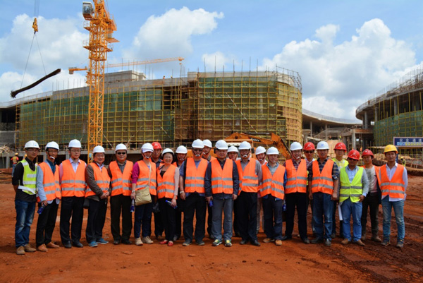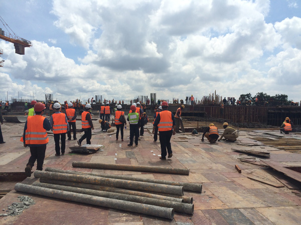 “雙河”項目是一個集零售商場、現代辦公樓、公共娛樂以及配套設施的綜合性工程,作為東非最大的在建城市綜合體,總建筑面積為18.2萬平方米,單層面積就超過四萬多平米。雖然出國前我對“雙河”項目就有一定的了解,但親臨現場,感受工地的壯觀,內心仍然受到巨大的震撼。這個項目涉及到的工程類別較多,施工統籌及安全質量監控難度較大。在施工現場,我們看到各作業工種工作安排得井井有條,各類安全標識及安全設施科學規范,雖然現場施工作業人數超過1000多人,但讓人感覺既熱火朝天,又忙而不亂有條不紊地進行著。